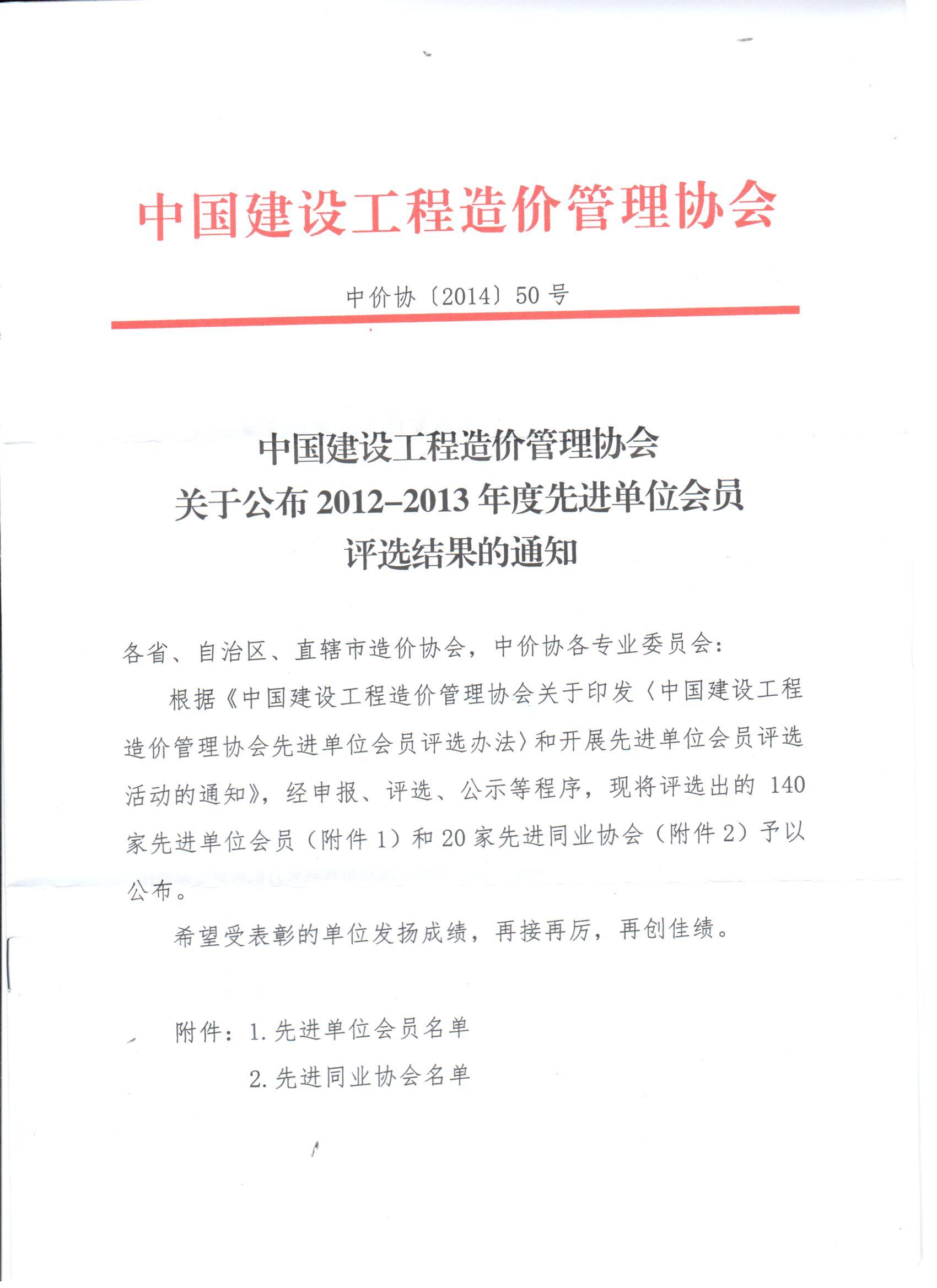 公司被评为中价协2012-2013年度先进单位会员