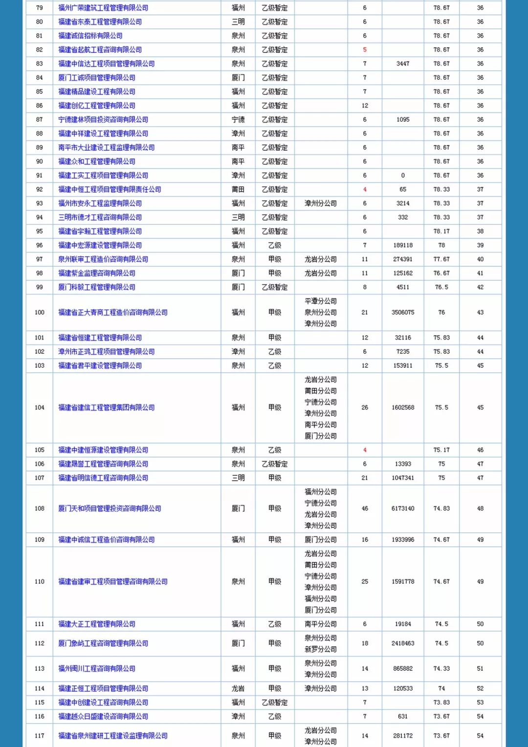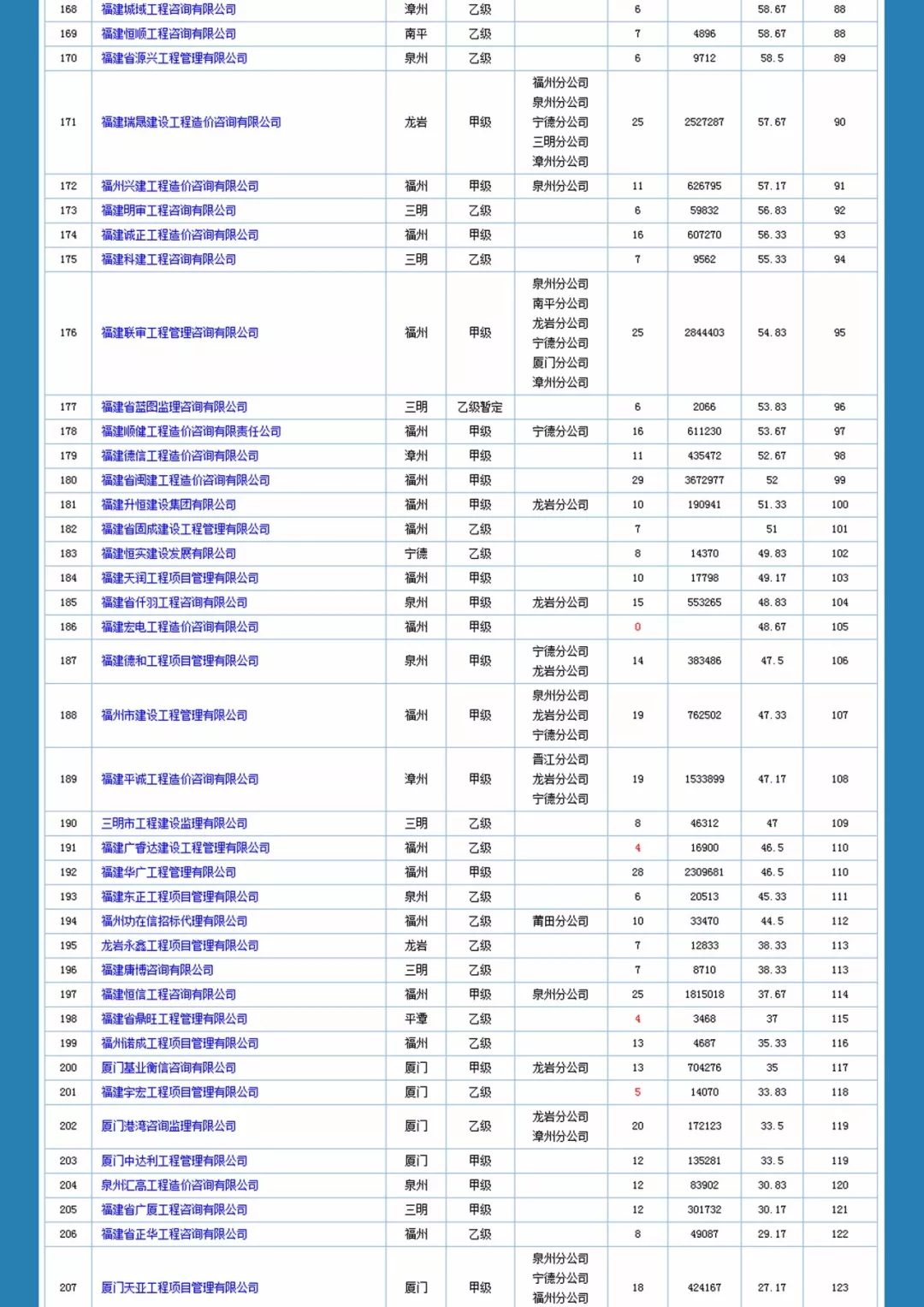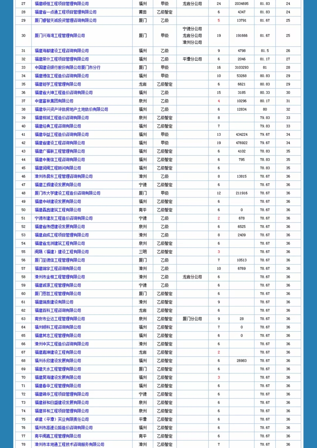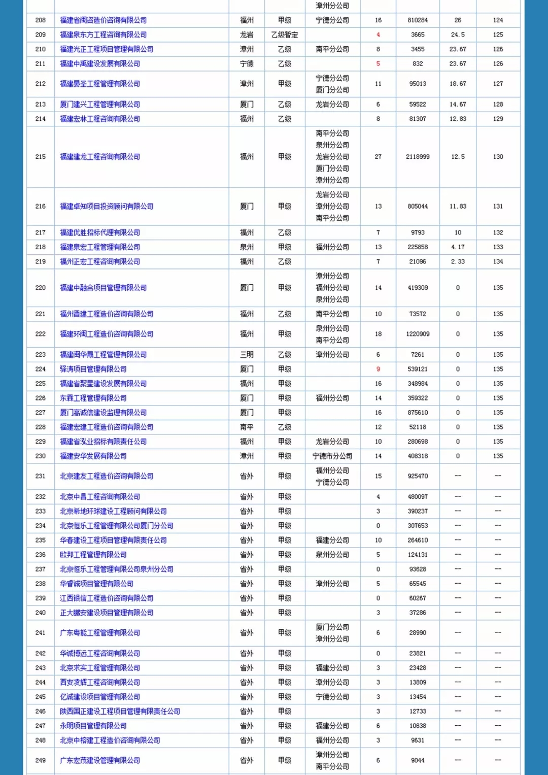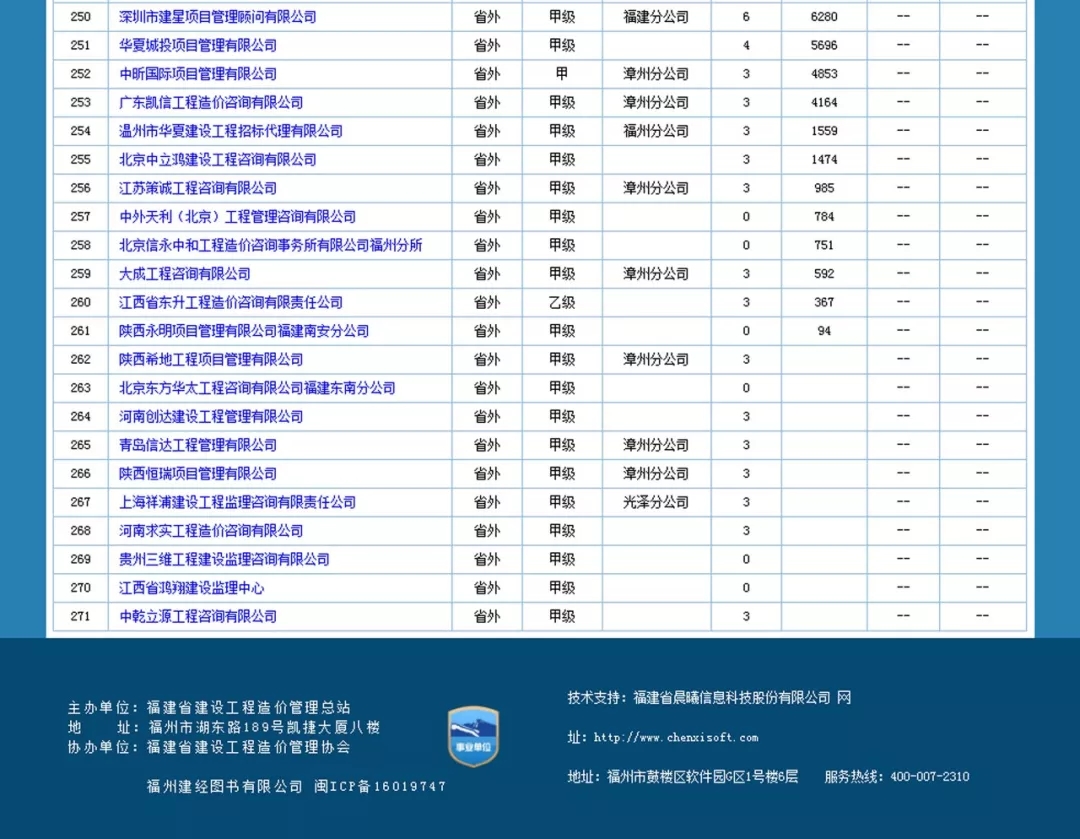 福建省造价咨询企业信用一览表如下: