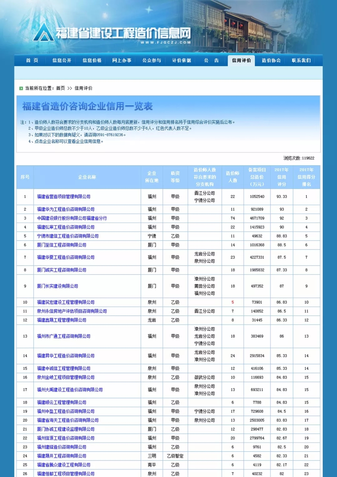 近日,福建省建设工程造价信息网公布《2017年度工程造价咨询企业信用综合评价结果》。 我公司2017年度信用得分排名第七,2017年度备案项目总造价排名第三。两项指标综合体现了我公司综合实力强,在福建业内名列前茅,仅次于央企建行福建省分行。我公司将再接再励,向同行先进单位学习,进一步提高发展!