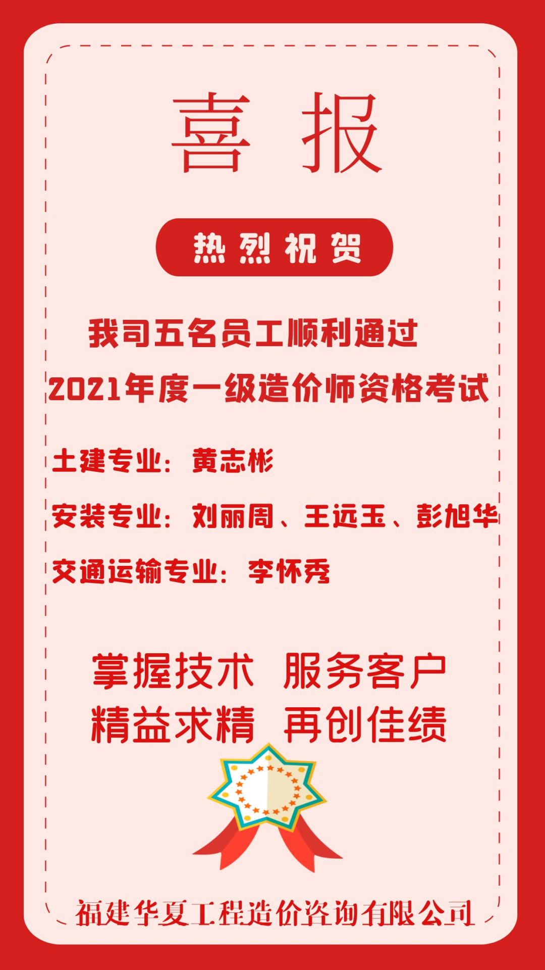 喜报!热烈祝贺我司五名员工顺利通过2021年度一级造价师资格考试!
